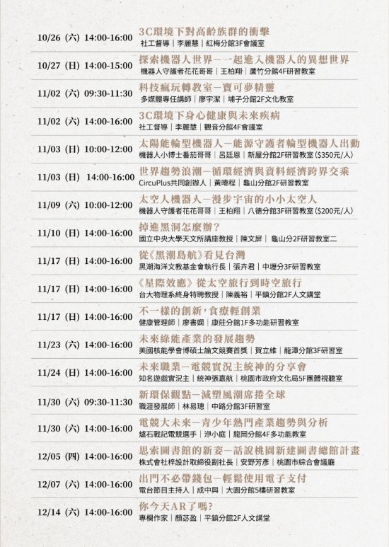 一、科技日新月異,對於未來的想像隨時在變化,本館策劃「未來˙學」活動,內容包含天文、科技、疾病、地球環保、媒體、電競等多方面議題,邀請民眾一同感受未來新面貌,共計18場活動,除部分場次酌收材料費外,活動皆為免費,請協助廣為宣傳並鼓勵同仁、民眾及學生踴躍參加。