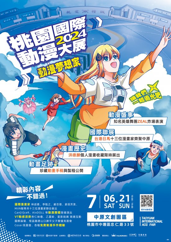 一、「2024桃園國際動漫大展」訂於本(113)年7月6日至21日假 中原文創園區辦理,今年主題為「動漫夢想家--讓我們一 起追光吧!」,期透過精彩作品帶大家看見超越國界、跨越 文化追求夢想的精神,沉浸在動漫迷人的光彩中,對生活 保有做夢、追夢的能量,找到屬於自己的亮光。