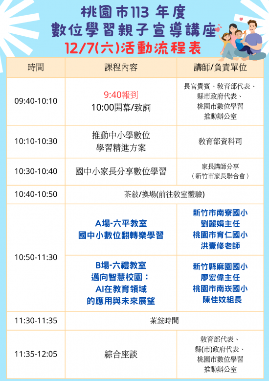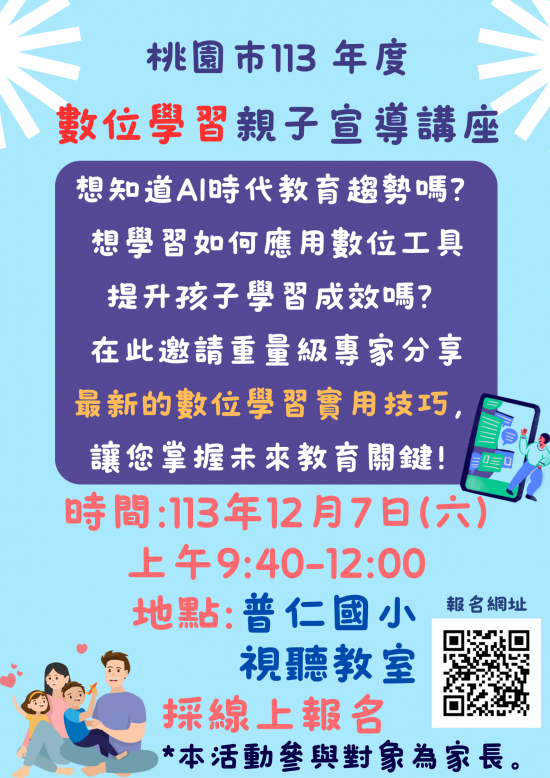 四、報名資訊如下: (一)「家長」請至google表單報名,網址為https://forms. gle/osTzYVYoNVd6SSeLA (二)「教師」請至桃園市教育發展資源入口網教師研習系統 (https://drp.tyc.edu.tw/TYDRP/Index.aspx)報名,活 動編號:E00030-241100009,網址為https://drp.tyc. edu.tw/TYDRP/QRCode.aspx?c208edf2-a702-11ef-9700 005056a6786f,全程參與者將核予2小時研習時數。