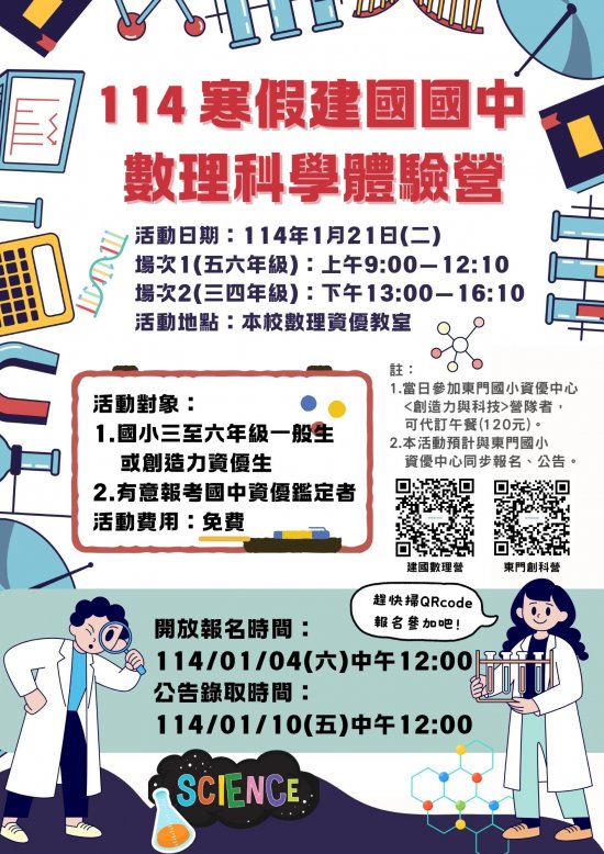 3、錄取名單於1月10日(五)12:00公告於建國國中網頁、粉絲頁。