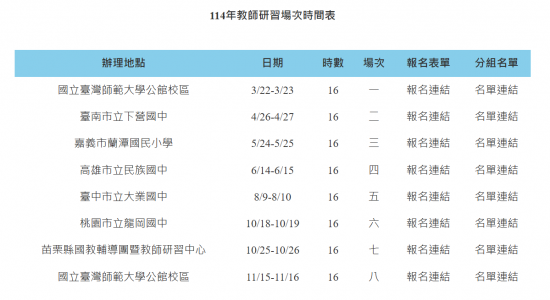 | (四) | 第四場次高雄場:114年6月14日(星期六)至6月15日(星期日);研習地點:高雄市立民族國民中學;報名連結:https://forms.gle/BqHL6w8P33Syhtc27。 |
