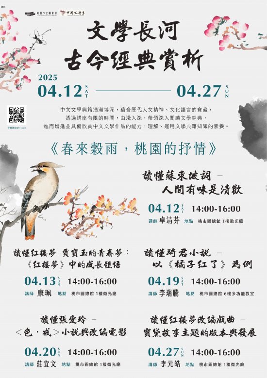 | 主旨: | 本館自114年4月12日至114年4月27日止,辧理「文學長河 古今經典賞析」首波講座,檢送海報電子檔一份,敬請貴機關協助宣傳,鼓勵所屬師生及同仁踴躍參加,請查照。 |