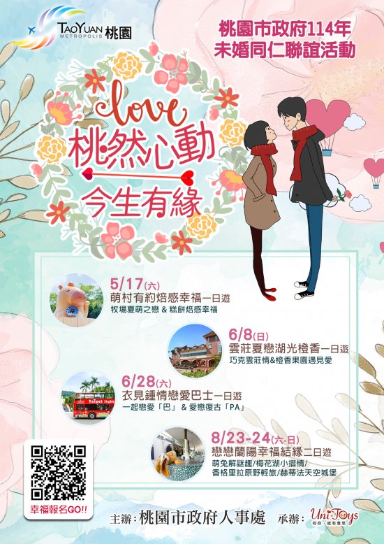 | 主旨: | 桃園市政府桃園市政府府訂於114年5月至8月期間,辦理114年「桃然心動 今生有緣」未婚同仁聯誼活動,請轉知並鼓勵所屬符合資格之同仁踴躍報名參加,請查照。 |