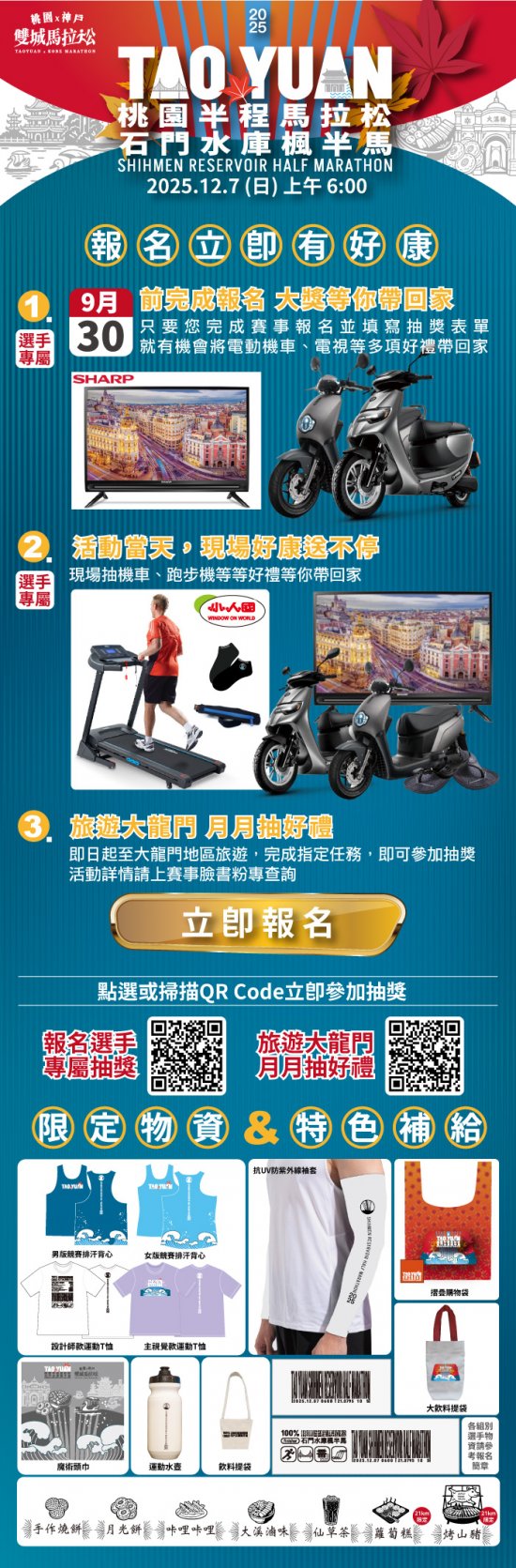 | 主旨: | 本市「2025桃園半程馬拉松 石門水庫楓半馬」活動報名期限自即日起至114年9月30日止,請協助公告宣傳,並鼓勵所屬踴躍報名參加,請查照。 |