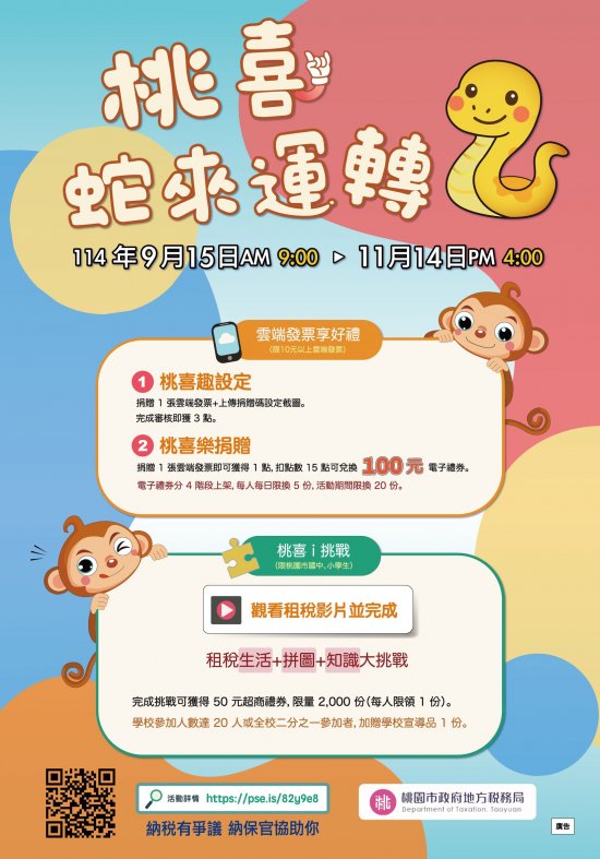 一、為有效推廣校園租稅教育,強化學生對租稅認識之深度及廣度,落實租稅教育向下扎根校園之目的,本局舉辦「桃喜蛇來運轉」網路活動,特別規劃「桃喜i挑戰」單元(詳活動內容三),請貴校協助利用電腦課程時間、校園網站、佈告欄或其他方式協助宣導,鼓勵學童及教職員踴躍參加。