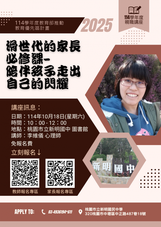 1、 | 教師請至「桃園市教育發展資源入口網」報名,全程參與者核予2小時研習時數,課程編號J00012-251000003。 |
