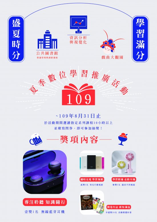 二、為增進各類型圖書館從業人員及其他公教人員之專業知能,該館規劃辦理「盛夏時分‧學習滿分-109年度夏季數位學習推廣活動」,於國家圖書館遠距學園數位學習平臺(https://cu.ncl.edu.tw/)開設「公共圖書館營運管理與創新發展」、「資訊分析與視覺化」及「戲曲大觀園」等系列課程,本(109)年7月1日至8月31日止於遠距學園選讀指定課程,並累計學習時數達10小時者,即可參加抽獎活動。
