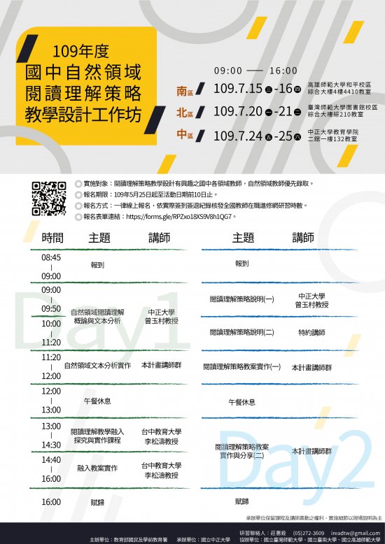 二、檢附109年暑期閱讀相關研習資訊表、「109年度國中自然領域閱讀理解策略教學設計工作坊」修正版宣傳海報、「109年度課文本位閱讀理解策略教學-進階工作坊(花蓮場)」宣傳海報、「109年度國中國文科閱讀理解策略教學工作坊」宣傳海報各1份。